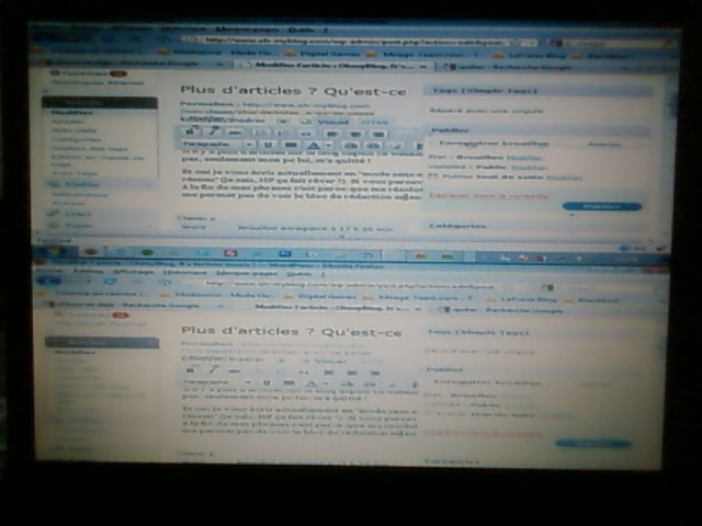 Et oui je vous écris actuellement en « mode sans échec avec prise en charge réseau » (je sais, HP ça fait rêver !). Si vous percevez des problèmes d’écriture à la fin de mes phrases c’est parce que ma résolution 640×800 buguée ne me permet pas de voir le bloc de rédaction en entier !